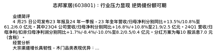 值得注意的是:2024年04月国金证券的张杨桓/尹新悦分析师,首次发布关于志邦家居的研究报告,标题为:志邦家居(603801):行业压力显现 逆势提份额可期。