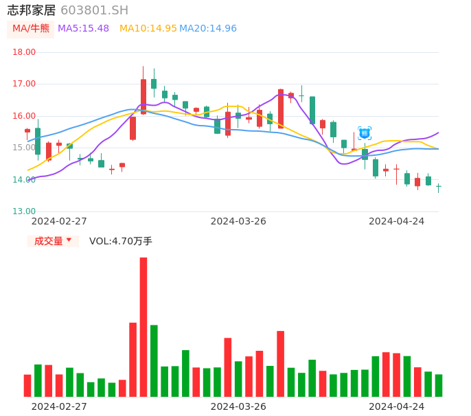 04月24日,志邦家居收报13.79,股价涨幅-0.29%,成交金额6441.45万元,换手率1.09%。