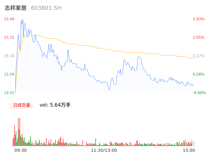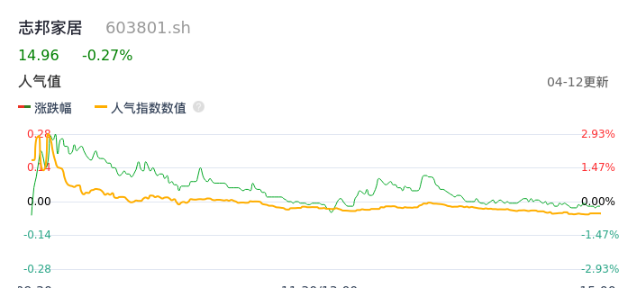 04月12日,志邦家居收报14.96,股价涨幅-0.27%,成交金额8551.46万元,换手率1.31%。