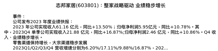值得注意的是:2024年03月中邮证券的杨维维/熊婉婷分析师,首次发布关于志邦家居的研究报告,标题为:志邦家居(603801):整家战略驱动 业绩稳步增长。