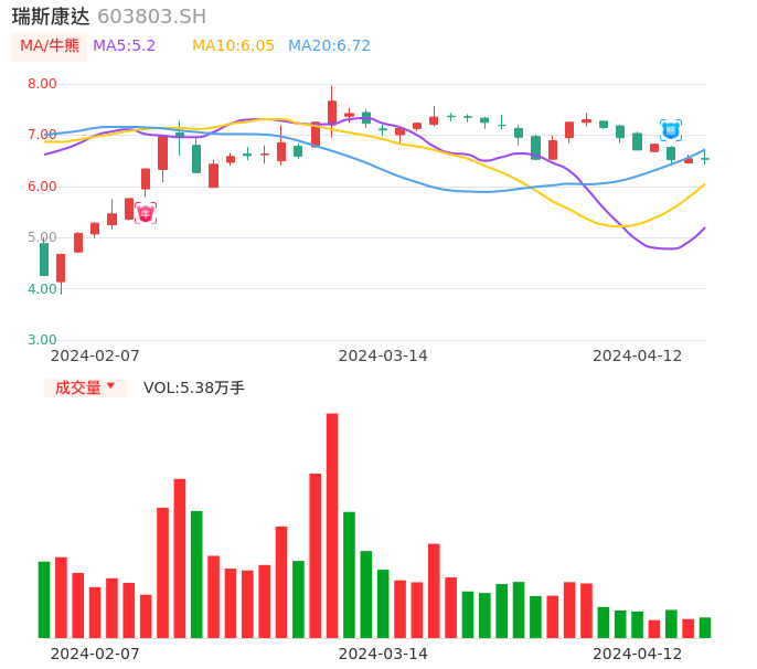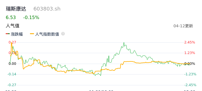 04月12日,瑞斯康达收报6.53,股价涨幅-0.15%,成交金额3535.41万元,换手率1.27%。