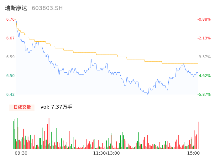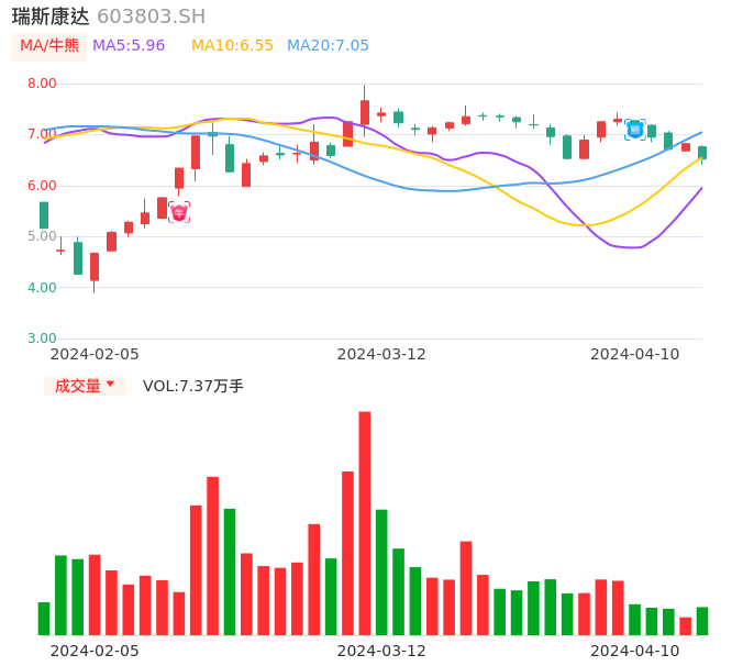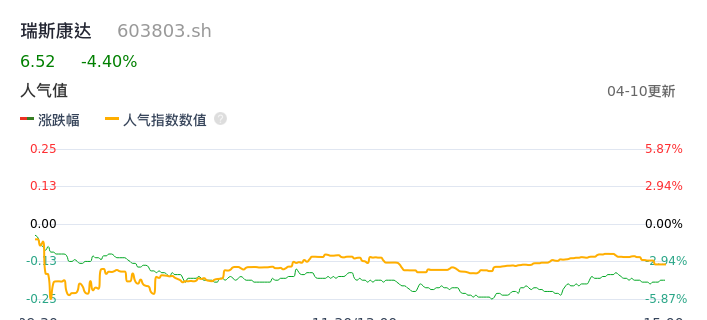 04月10日,瑞斯康达收报6.52,股价涨幅-4.40%,成交金额4828.07万元,换手率1.73%。