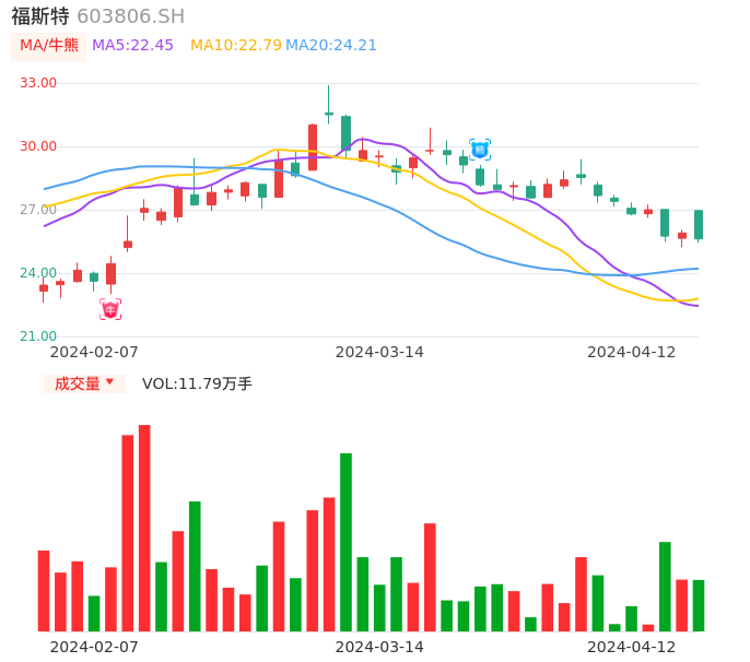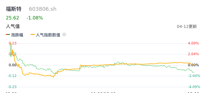 04月12日,福斯特收报25.62,股价涨幅-1.08%,成交金额3.06亿元,换手率0.63%。