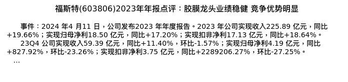 值得注意的是:2024年04月民生证券的分析师,首次发布关于福斯特的研究报告,标题为:福斯特(603806)2023年年报点评:胶膜龙头业绩稳健 竞争优势明显。