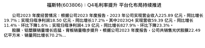 值得注意的是:2024年04月海通证券的徐柏乔分析师,首次发布关于福斯特的研究报告,标题为:福斯特(603806):Q4毛利率提升 平台化布局持续推进。