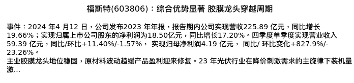 值得注意的是:2024年04月长城证券的分析师,首次发布关于福斯特的研究报告,标题为:福斯特(603806):综合优势显著 胶膜龙头穿越周期。