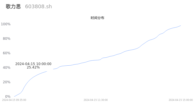 根据成交分布分析,该股票当天放量成交,成交清淡。时间上看,早盘前半小时成交量占据当天总成交量的25.42%;价格上看,成交呈现中间峰。成交分布分析主要研究股票成交的分布特性,不具有预测功能,请知悉。
