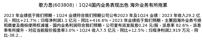 值得注意的是:2024年04月中金公司的林骥川/曾令仪分析师,首次发布关于歌力思的研究报告,标题为:歌力思(603808):1Q24国内业务表现出色 海外业务有所拖累。