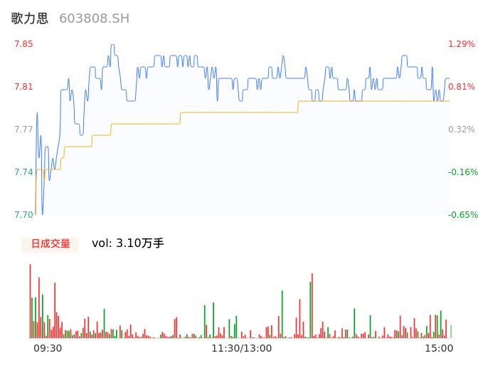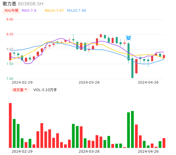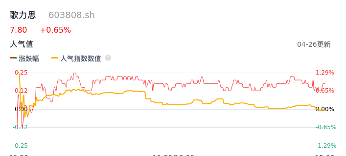 04月26日,歌力思收报7.80,股价涨幅0.65%,成交金额2417.69万元,换手率0.84%。