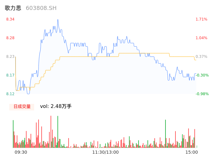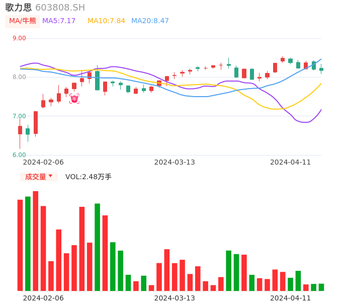 04月11日,歌力思收报8.17,股价涨幅-0.37%,成交金额2042.28万元,换手率0.67%。