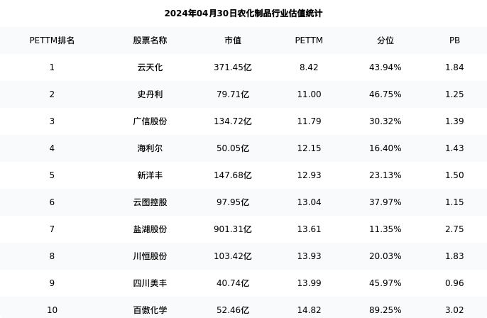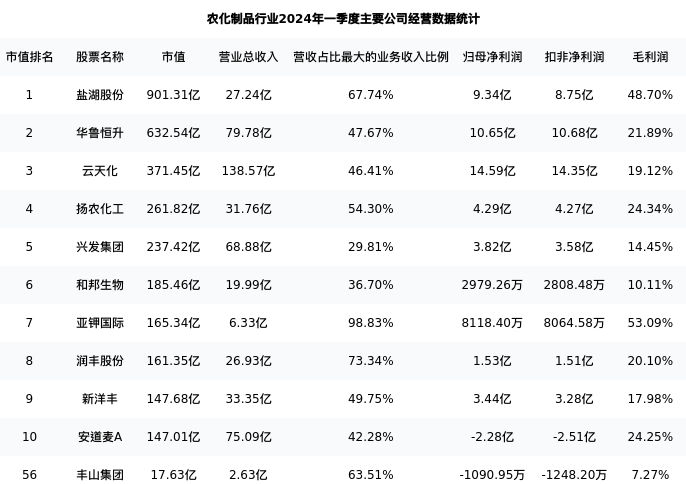 丰山集团最新报告期数据为一季度,下表汇总了农化制品行业内市值靠前的公司一季度主要经营数据