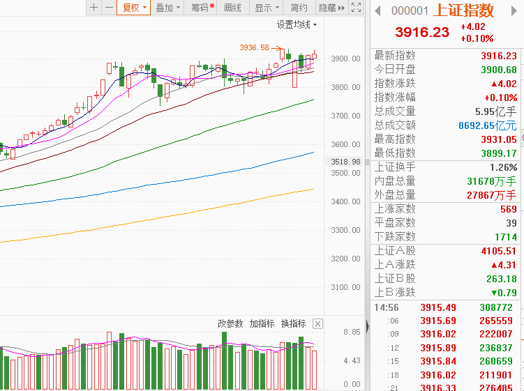 大盘分析及后市展望:今日A股市场整体表现疲软,指数冲高回落,成交额显著萎缩并创下近期新低,市场整体风险偏好下降,观望情绪浓厚。热点方面,开盘后充电桩概念回落,钢铁、风电、稀土永磁等板块走低,半导体震荡走高,存储芯片方向领涨;保险、银行、港口等红利板块震荡上行,股指震荡走高。受港股创新药大幅走高刺激,A股医疗、创新药、中药等板块同步走高;个股呈现普跌的局面,两市近4000股下跌。总得来看,市场依托权重稳定指数。