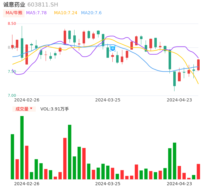 04月23日,诚意药业收报7.75,股价涨幅3.06%,成交金额2985.90万元,换手率1.19%。
