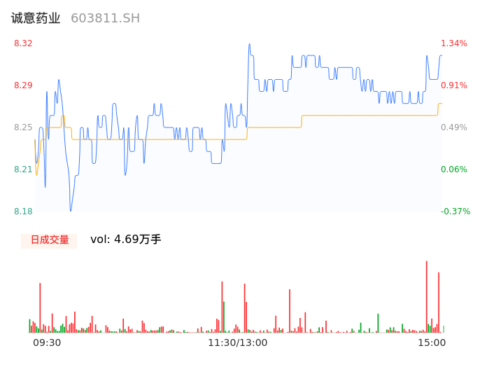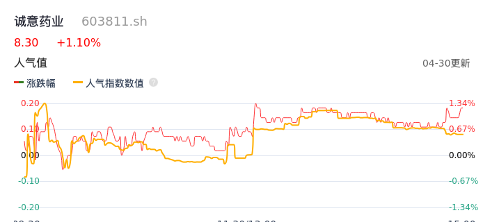 04月30日,诚意药业收报8.30,股价涨幅1.10%,成交金额3877.80万元,换手率1.43%。