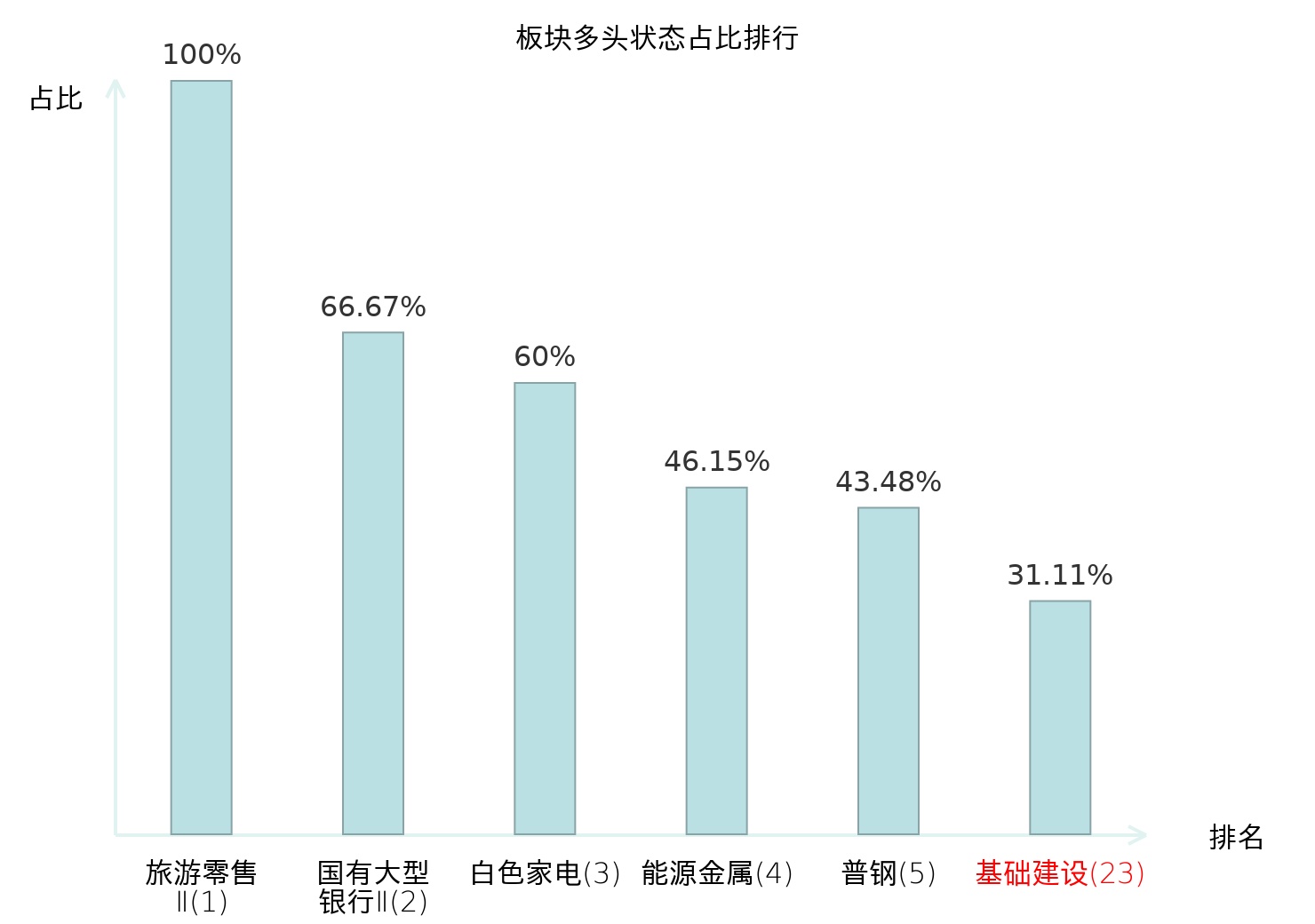 全市场所有行业板块中主力多头状态占比排名中,旅游零售Ⅱ板块位居第一。光学光电子板块名次提升最快,较昨日上升59位。