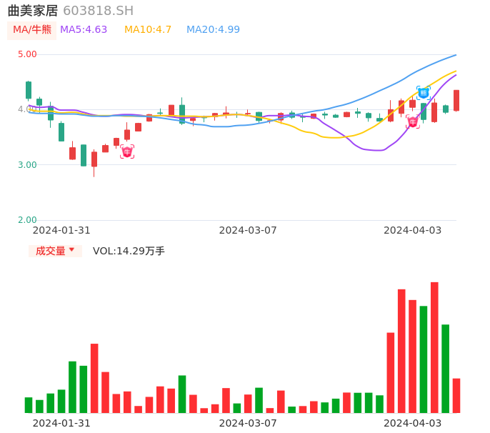 04月03日,曲美家居收报4.35,股价涨幅10.13%,成交金额6153.00万元,换手率2.46%。