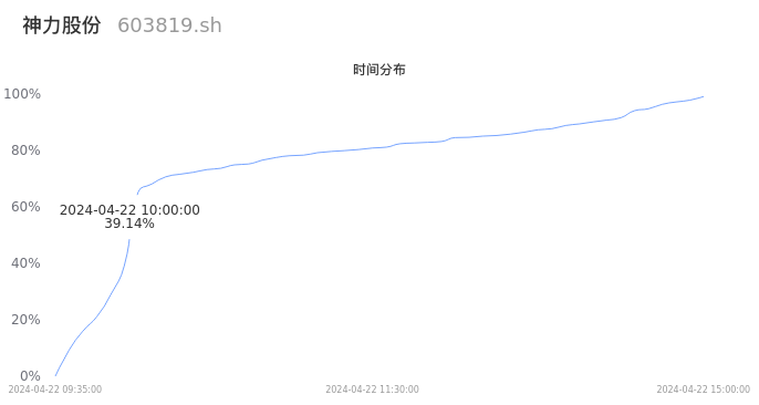 首先我们来看当日成交的时间分布。将今日交易时间按照5分钟的时间间隔进行切片,并绘制分布直方图进行观察。可以发现,10点之前的成交量占全天成交量的39.14%,这说明,该股票活跃时段换手火爆,资金热情高涨。