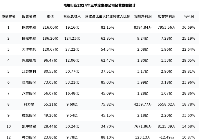 神力股份最新报告期数据为三季度,下表汇总了电机行业内市值靠前的公司三季度主要经营数据