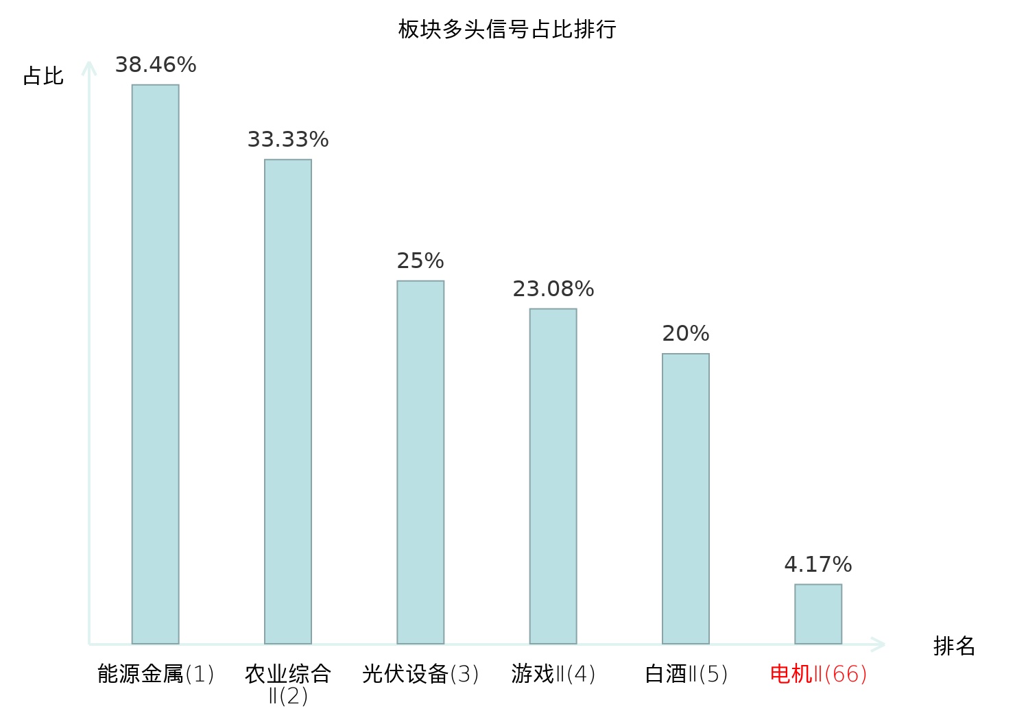 全市场所有行业板块中主力多头信号占比排名中,能源金属板块位居第一。农业综合Ⅱ板块名次提升最快,较昨日上升126位。