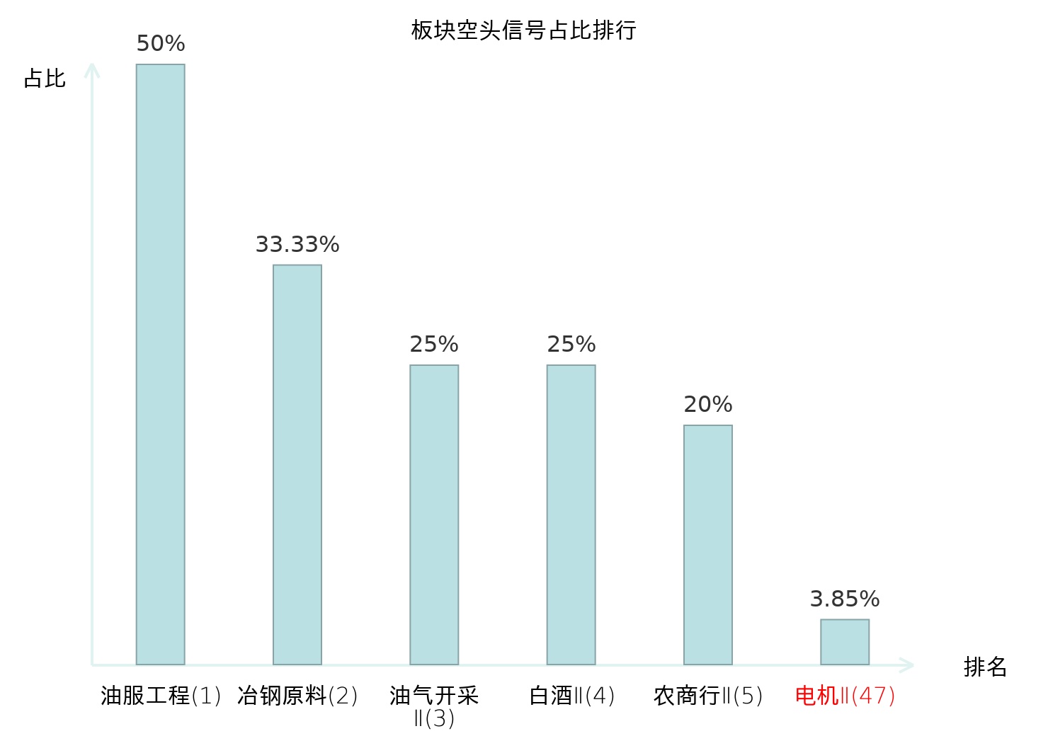 全市场所有行业板块中主力空头信号占比排名中,油服工程板块位居第一。白酒Ⅱ板块名次提升最快,较昨日上升110位。