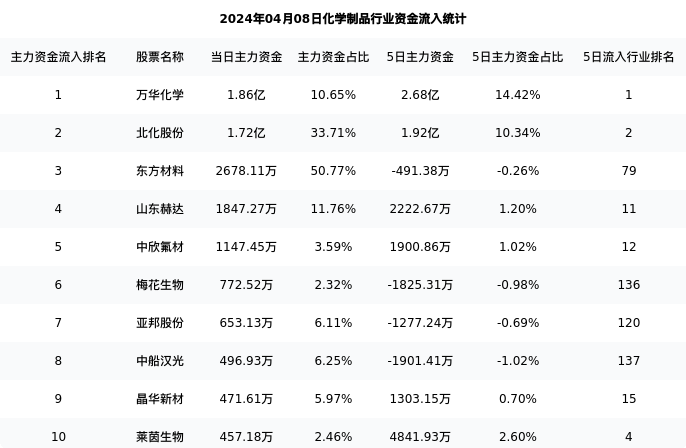 从主力资金流向来看,化学制品行业今日主力资金流入47.95亿元,在所有申万二级行业中排名:8/131。