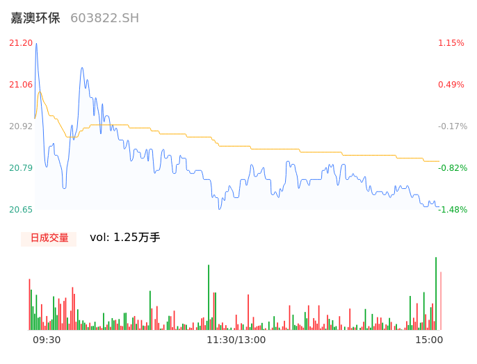 04月30日,嘉澳环保收报20.66,股价涨幅-1.43%,成交金额2600.34万元,换手率1.63%。
