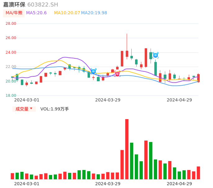 04月29日,嘉澳环保收报20.96,股价涨幅1.80%,成交金额4111.11万元,换手率2.59%。