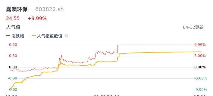 04月12日,嘉澳环保收报24.55,股价涨幅9.99%,成交金额1.42亿元,换手率7.82%。