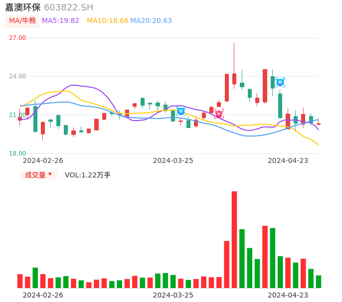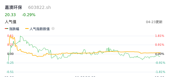 04月23日,嘉澳环保收报20.33,股价涨幅-0.29%,成交金额2496.09万元,换手率1.59%。