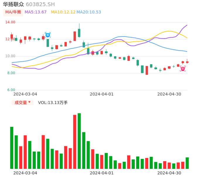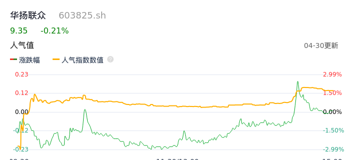 04月30日,华扬联众收报9.35,股价涨幅-0.21%,成交金额1.22亿元,换手率5.18%。