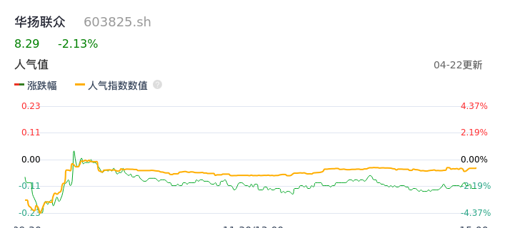 04月22日,华扬联众收报8.29,股价涨幅-2.13%,成交金额5356.56万元,换手率2.55%。