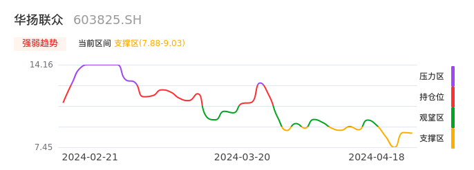 我们来看一下该股的九方特色指标强弱趋势的情况:华扬联众自04月15日进入支撑区。股价出现一波快速下跌行情,目前下跌动能仍未衰竭。建议继续谨慎观望。注意今日下方支撑位:7.88元,如有效跌破将可能出现新一轮下跌。