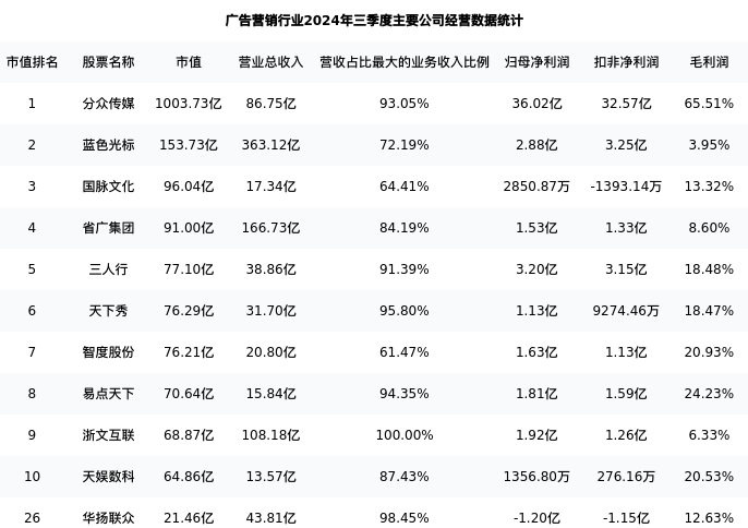 华扬联众最新报告期数据为三季度,下表汇总了广告营销行业内市值靠前的公司三季度主要经营数据