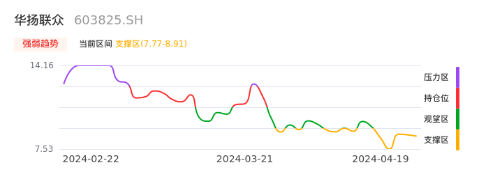 我们来看一下该股的九方特色指标强弱趋势的情况:华扬联众自04月15日进入支撑区。股价出现一波快速下跌行情,目前下跌动能仍未衰竭。建议继续谨慎观望。注意今日下方支撑位:7.77元,如有效跌破将可能出现新一轮下跌。