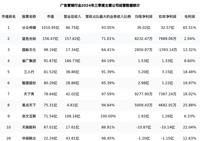华扬联众最新报告期数据为三季度,下表汇总了广告营销行业内市值靠前的公司三季度主要经营数据