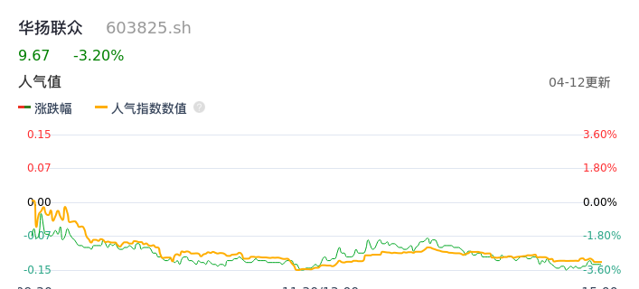 04月12日,华扬联众收报9.67,股价涨幅-3.20%,成交金额1.06亿元,换手率4.28%。