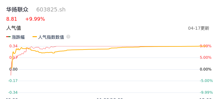 04月17日,华扬联众收报8.81,股价涨幅9.99%,成交金额1.08亿元,换手率4.93%。