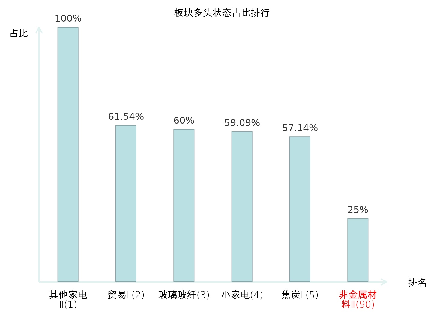 全市场所有行业板块中主力多头状态占比排名中,其他家电Ⅱ板块位居第一。摩托车及其他板块名次提升最快,较昨日上升76位。