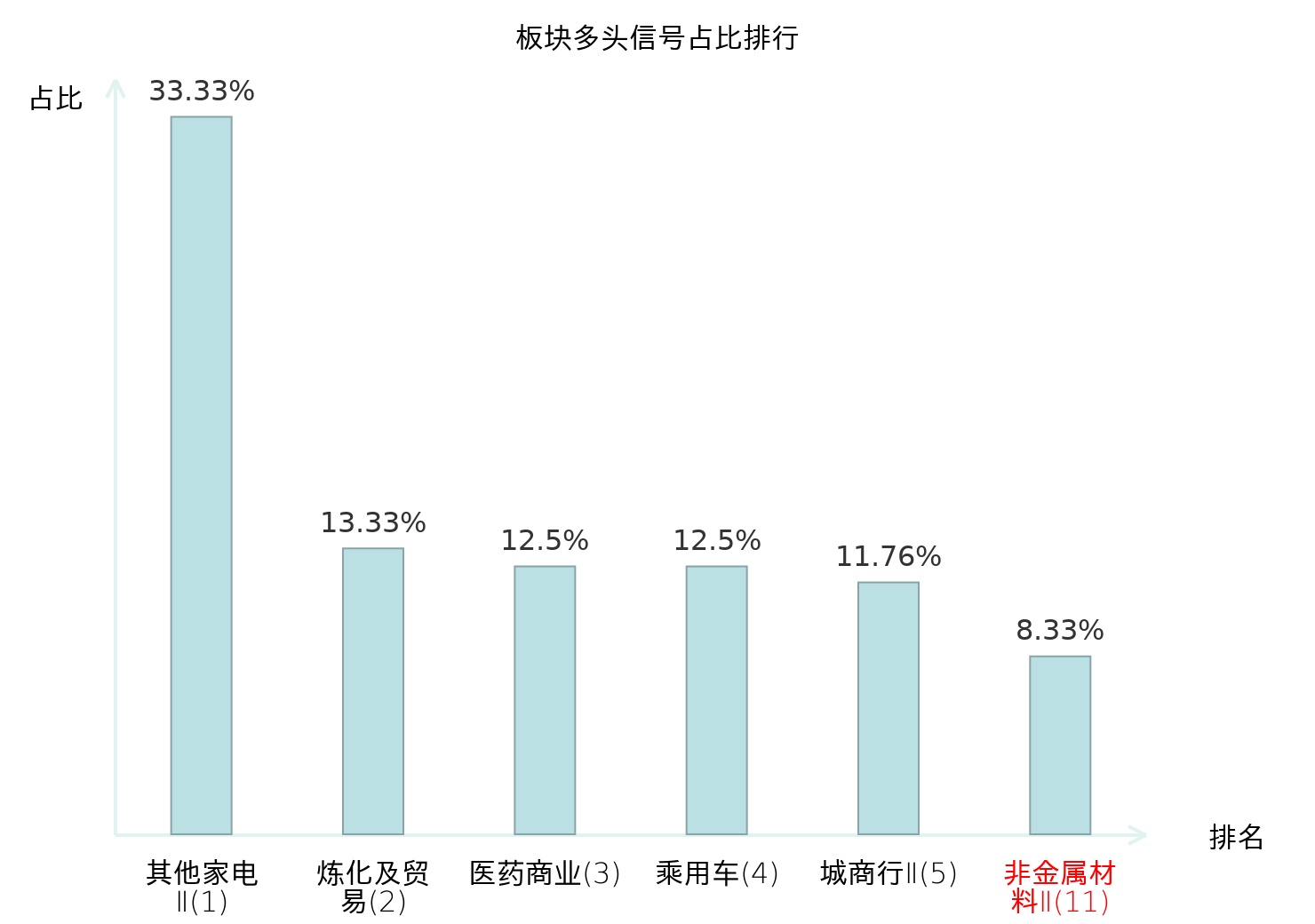 全市场所有行业板块中主力多头信号占比排名中,其他家电Ⅱ板块位居第一。其他家电Ⅱ板块名次提升最快,较昨日上升128位。