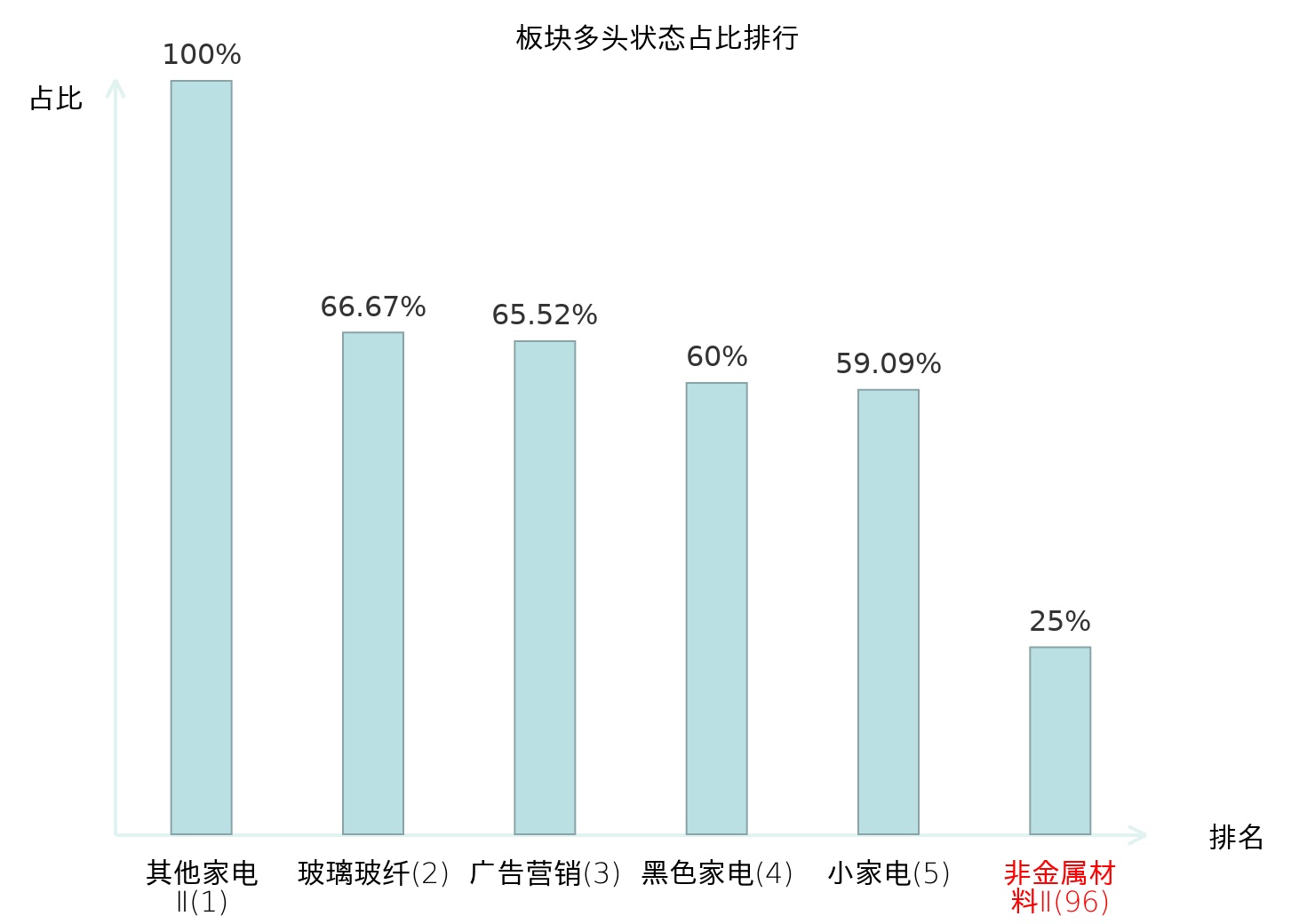 全市场所有行业板块中主力多头状态占比排名中,其他家电Ⅱ板块位居第一。航天装备Ⅱ板块名次提升最快,较昨日上升79位。