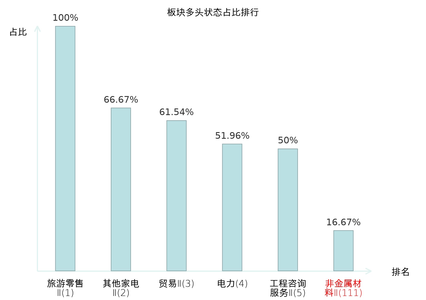 全市场所有行业板块中主力多头状态占比排名中,旅游零售Ⅱ板块位居第一。文娱用品板块名次提升最快,较昨日上升84位。