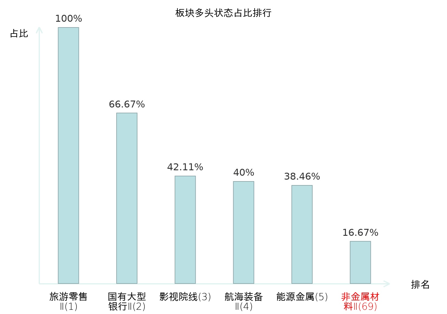 全市场所有行业板块中主力多头状态占比排名中,旅游零售Ⅱ板块位居第一。林业Ⅱ板块名次提升最快,较昨日上升102位。
