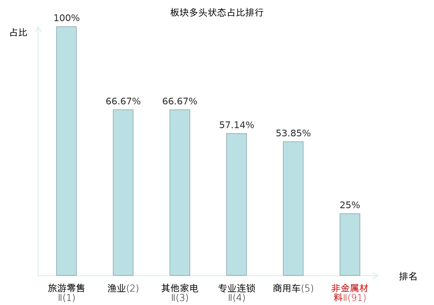 全市场所有行业板块中主力多头状态占比排名中,旅游零售Ⅱ板块位居第一。农产品加工板块名次提升最快,较昨日上升46位。