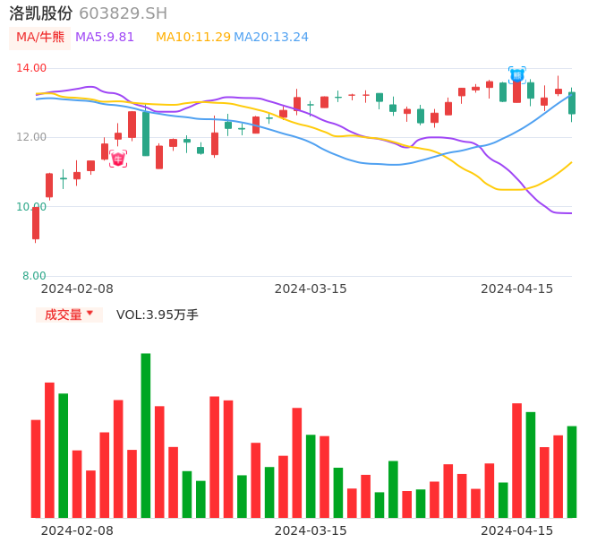 04月15日,洛凯股份收报12.68,股价涨幅-5.30%,成交金额5092.29万元,换手率2.47%。
