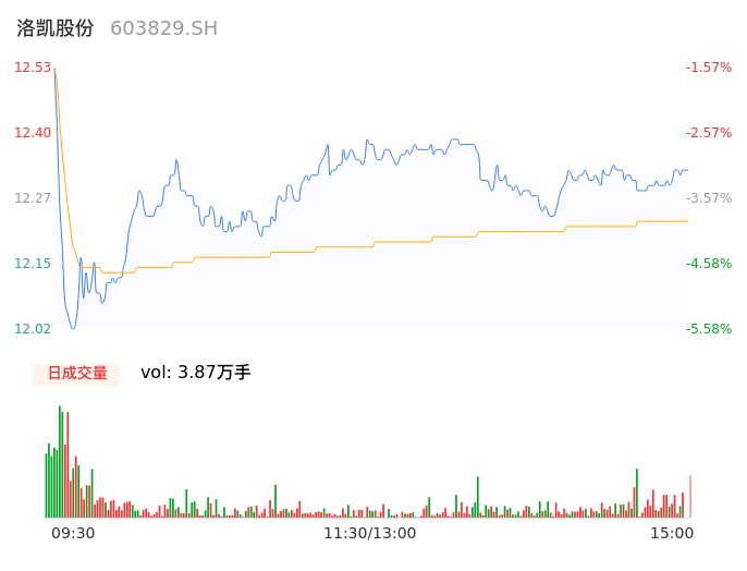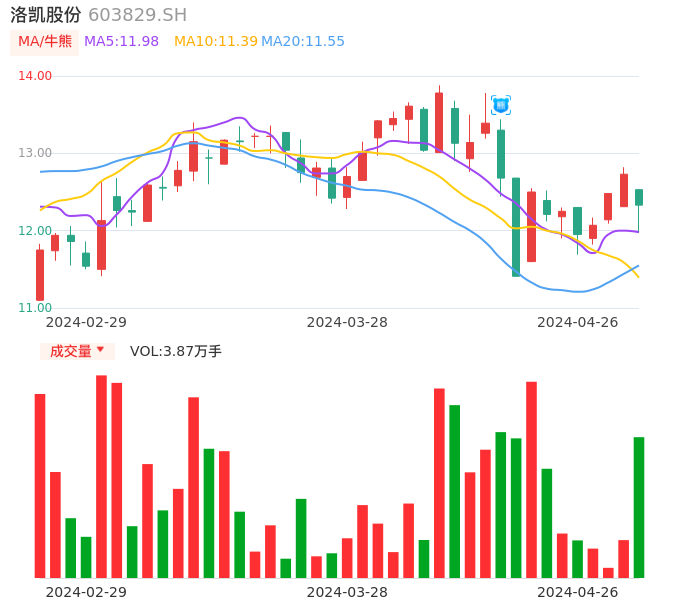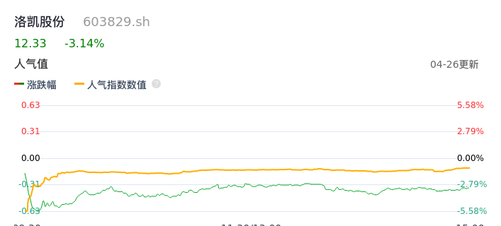 04月26日,洛凯股份收报12.33,股价涨幅-3.14%,成交金额4733.20万元,换手率2.42%。