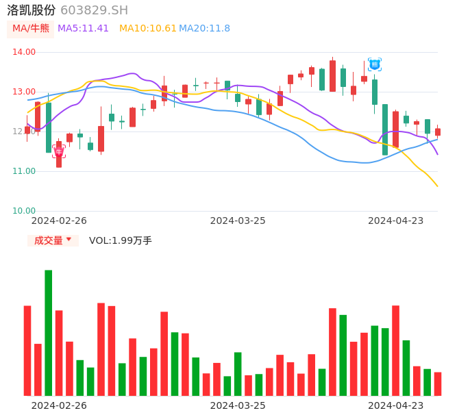 04月23日,洛凯股份收报12.07,股价涨幅1.00%,成交金额2406.23万元,换手率1.25%。