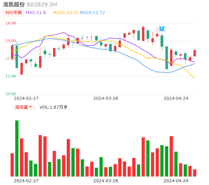 04月24日,洛凯股份收报12.48,股价涨幅3.40%,成交金额2064.13万元,换手率1.04%。