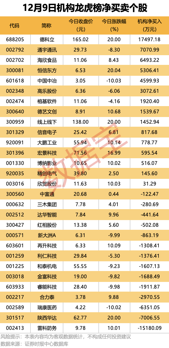 今日龙虎榜中,净买入个股有15只,净卖出的个股为14只。9股净买入金额均超千万元,德科立获机构净买入近1.75亿元,居首;其次是通宇通讯,机构净买入金额为7070.99万元。