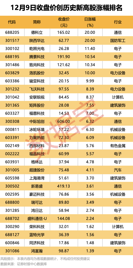 收盘价创历史新高股中,今日股价平均上涨4.96%,涨停的有陕西华达、德科立、洛凯股份等,涨幅居前的有乾照光电、腾景科技、致尚科技等。