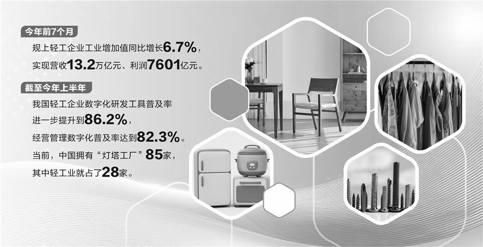 今年9月举行的第十五届中国轻工业信息化大会上透露了一组数据:截至今年上半年,我国轻工企业数字化研发工具普及率进一步提升到86.2%,经营管理数字化普及率达到82.3%,轻工智能化基础进一步夯实。当前,中国拥有“灯塔工厂”85家,其中轻工业就占了28家,全国占比达33%。